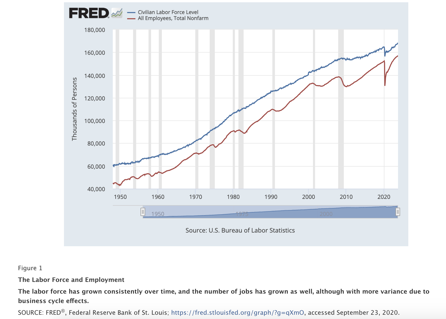 “The lump of labor fallacy is the assumption that there is a fixed amount of work to be done. If this were true, new jobs could not be generated, just redistributed. Those who believe the fallacy have often felt threatened by new technology or the entrance of new people into the labor force. These fears are rooted in a mistaken zero-sum view of the economy, which holds that when someone gains in a transaction, someone else loses. It’s a tempting idea to some because it seems to be true. For example, jobs can be lost to automation and immigration. However, that is not the full story. In reality, the demand for labor is not fixed. Changes in one industry can be offset, or overshadowed, by growth in another. And as the labor force grows, total employment increases too (Figure 1).”