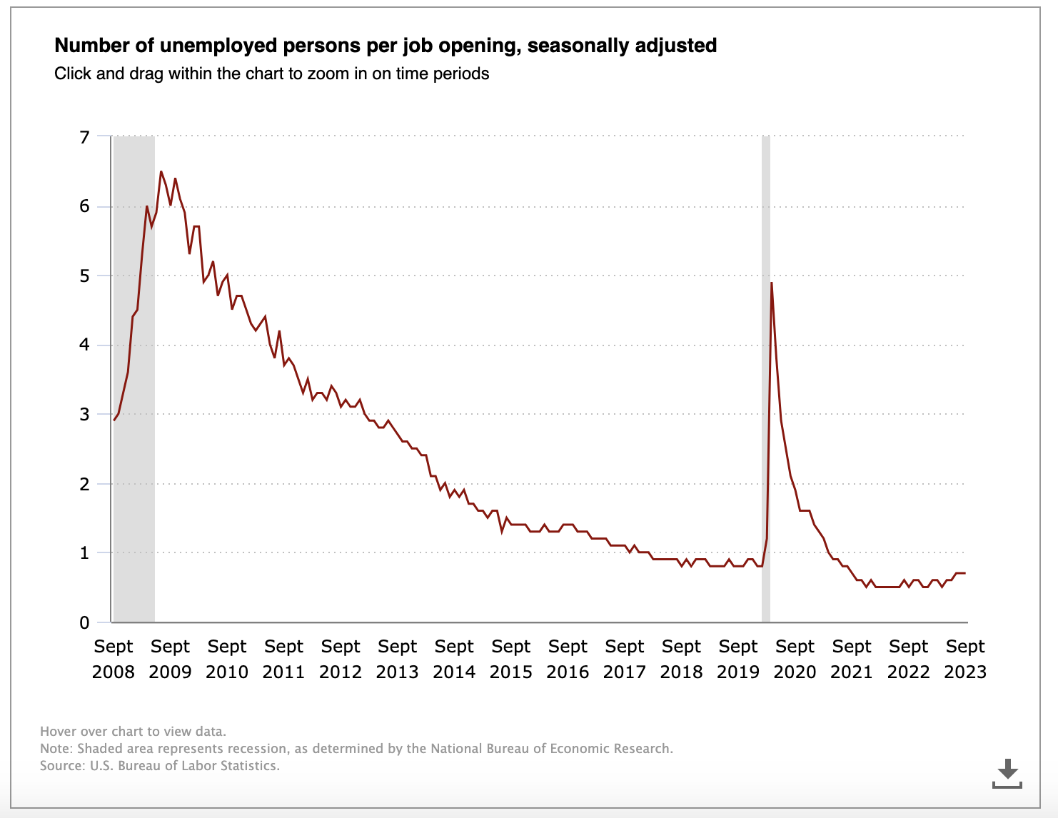 The red line going below “1” in the graph means there are more jobs than unemployed people. It’s solidly below 1 right now.