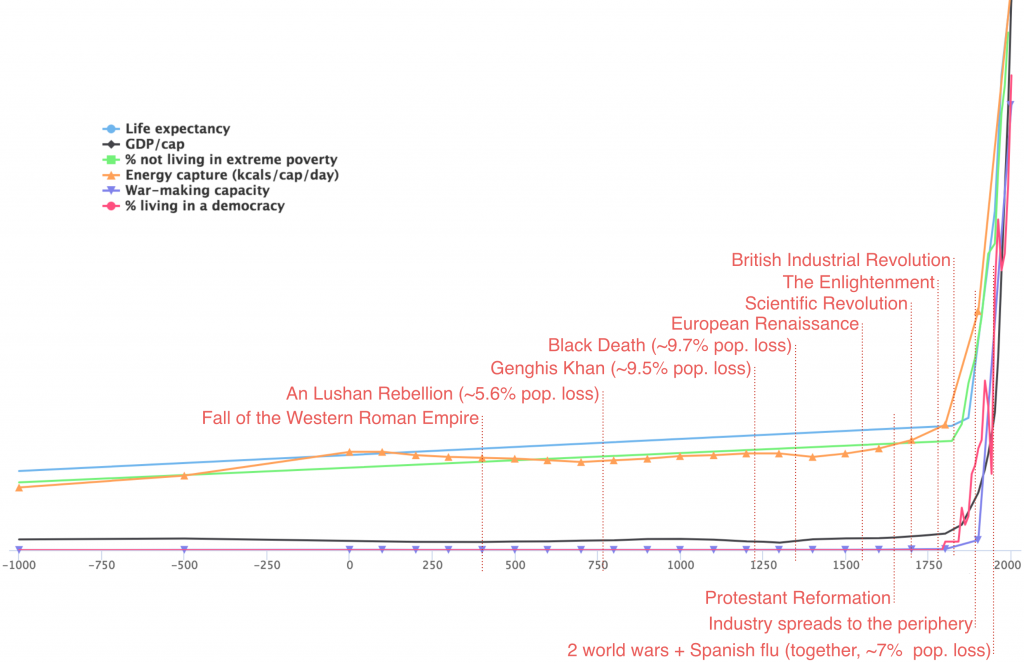Technology is of course important. Only one thing has inflected the curve of human prosperity: the invention of the first commercially successful steam engine, in 1712³.